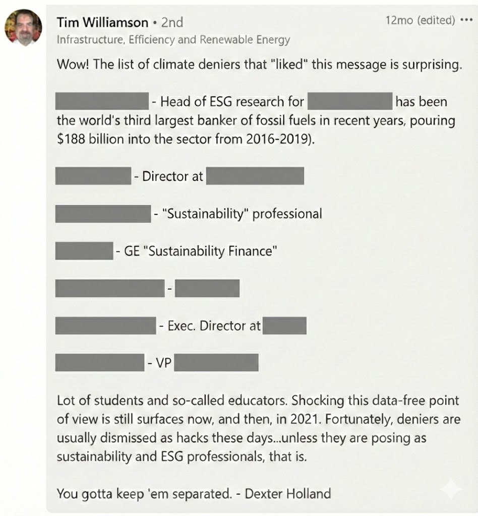 Worse still, people who challenge the evidence are sometimes portrayed as racist, sexist, and anti-science. Indeed, on LinkedIn, even “liking” a message that expresses a different view can be met with you being named and shamed and being labelled a climate denier.